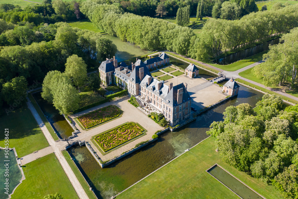 Beautiful medieval castle. Aerial View Shot of Castle. Château de Courances (Domaine de Courances). French castle. drone aerial view with landscaped gardens and the surrounding area.