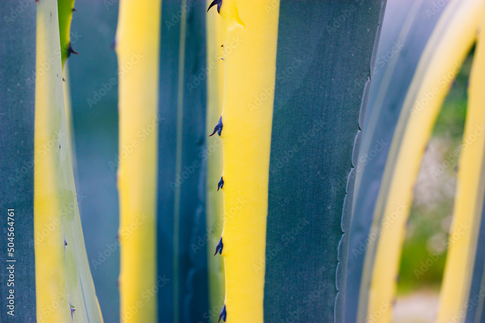 Long smooth leaves of striped green and yellow Agave americana. A heat-loving exotic plant in botanical garden. Agave is used to make the alcoholic drink mescal. Tropical foliage abstract background.