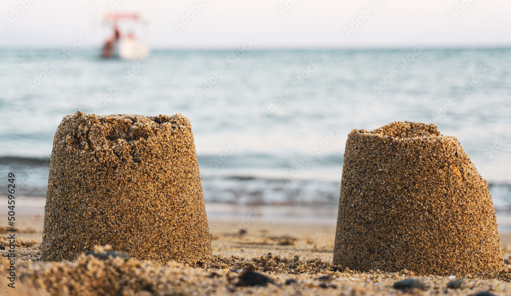 Sand castle on beach at summer vacation by the blue sea. Child having fun on holiday concept idea. No people.
