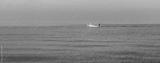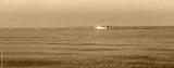 Single fishing boat on sea with clear sky, minimalist photography concept idea with space for ad or advertisement text. High resolution photo.