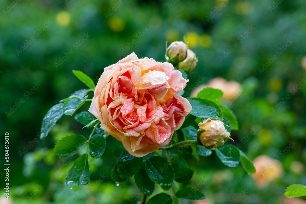 The bud of a peach-orange rose on a stem in a spring botanical garden on a rainy day against a green blurry background. Growing roses in a rose garden, greenhouse, summer city park. Selective focus.