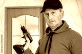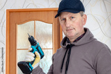 A craftsman with a cordless screwdriver in his hand in a room near the door