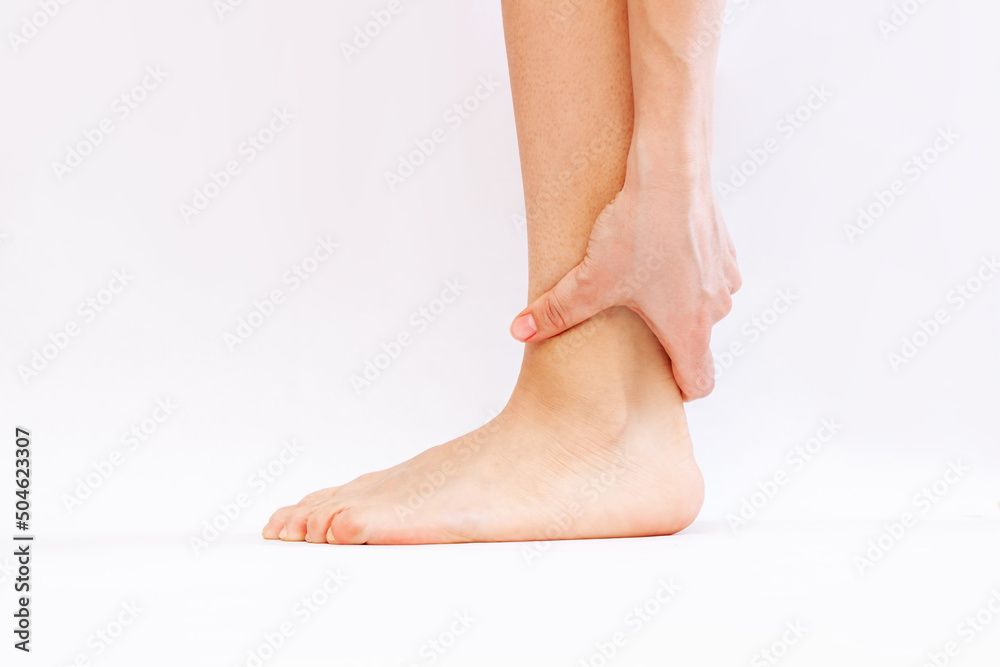 A young woman touching painful twisted or broken ankle with her hand isolated on a white background. The girl twisted her leg. Sport injury, painful sprained ankle muscle