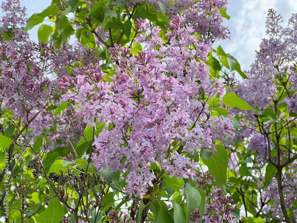 Lilac flowers bush in the garden. Beautiful pink purple lilac blossom.