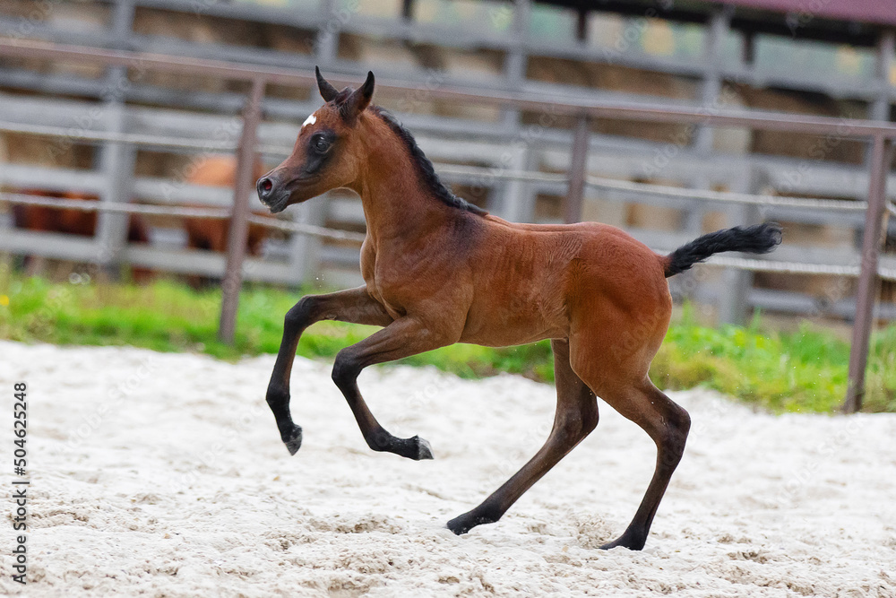Young pretty arabian horse foal runs and frolics summer background