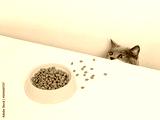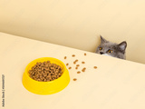 A cute gray cat and a bowl of food on a yellow background. Reaching for his favorite food, little thief.