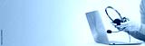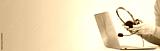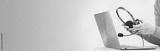 Laptop. headphones or headset on desk and plain background. Female hands over laptop. Distant learning or working from home, online courses or support concept. Helpdesk or call center operator. banner