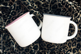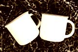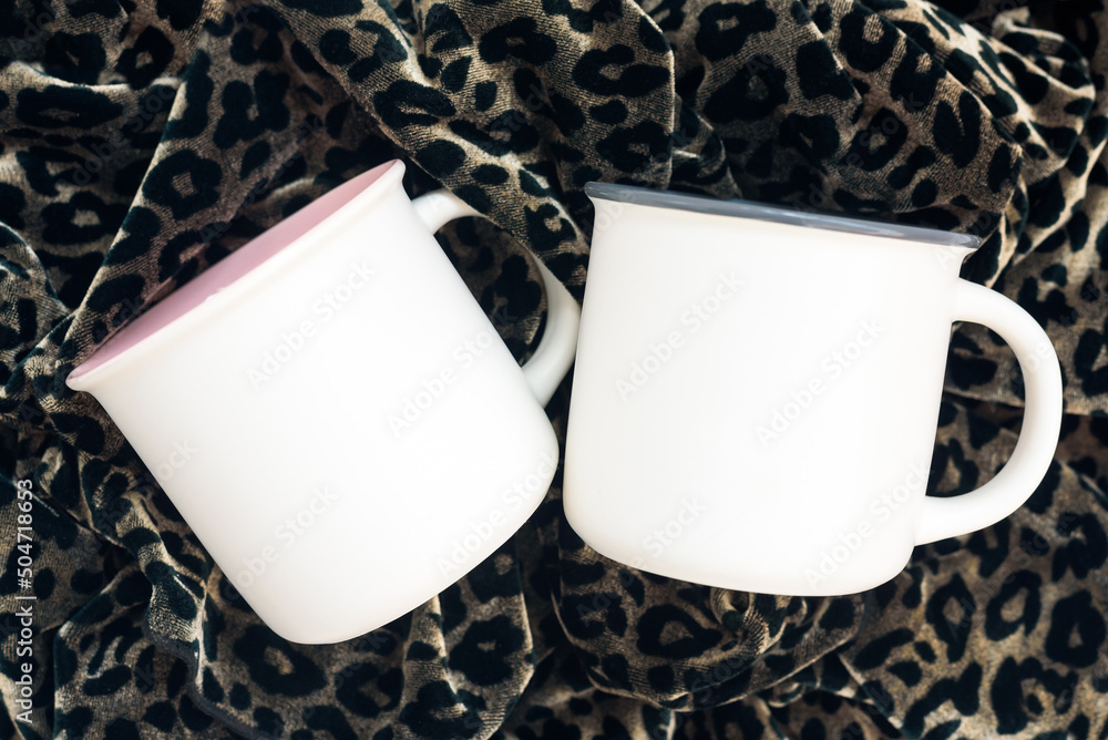 Two white coffee mugs blank mockup on plush leopard animal blanket, flatlay composition, copyspace, top view.