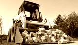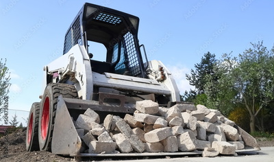 Skid steer loader for construction site with loading bucket filled with bricks.