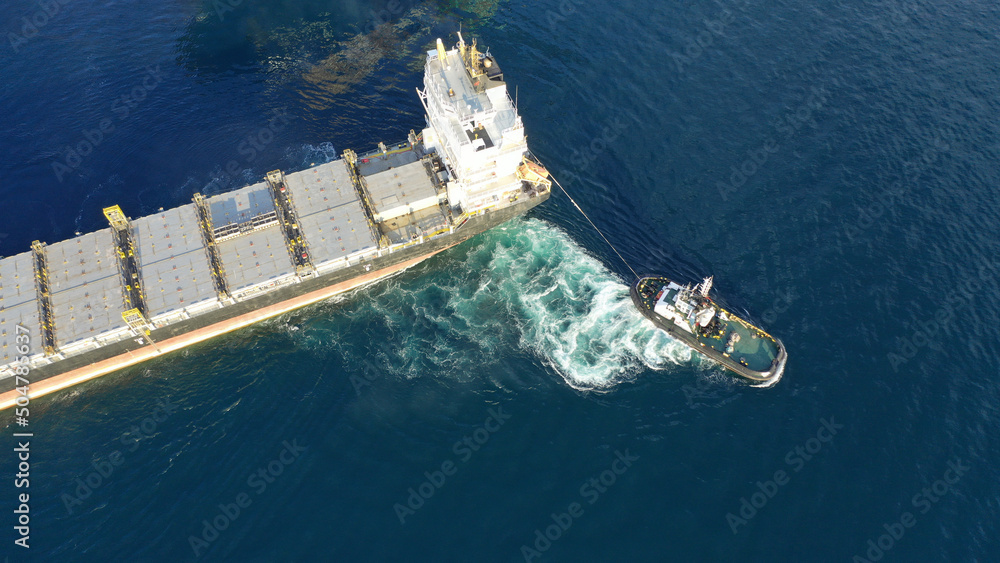 Aerial drone top down photo of tow - tug boat assisting by pulling empty container ship to depart from container terminal port