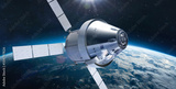 Orion spacecraft flight in space on orbit of Earth. Sci-fi wallpaper. Artemis space program. Expedition to Moon. Spaceship with astronauts. Elements of this image furnished by NASA