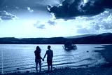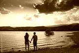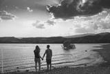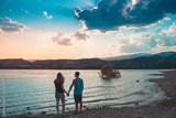 Young Attractive Couple holding hands in a Beautiful Lake in summer during sunset. Discovery Travel love Destination Concept.