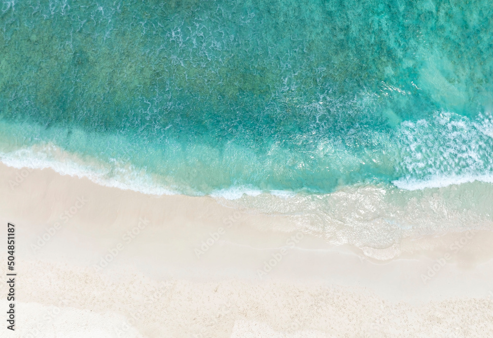 Aerial view of the tropical summer with Sea Waves Crashing on Shore and white sand beach