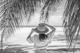 Summer beach vacation concept, Happy woman with hat relaxing at the seaside and looking away, in the summer against a backdrop of palm trees and sea beach.