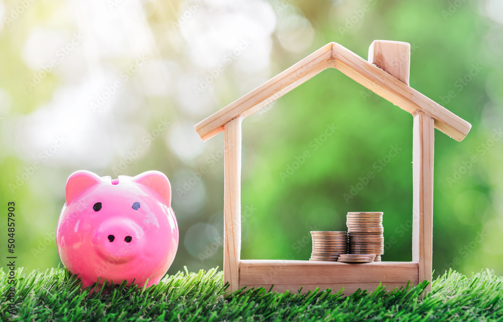 Coins placed in a model wooden house and a Piggy bank on the grass. planning savings money of coins to buy a home concept for property, mortgage and real estate investment, savings for a house.
