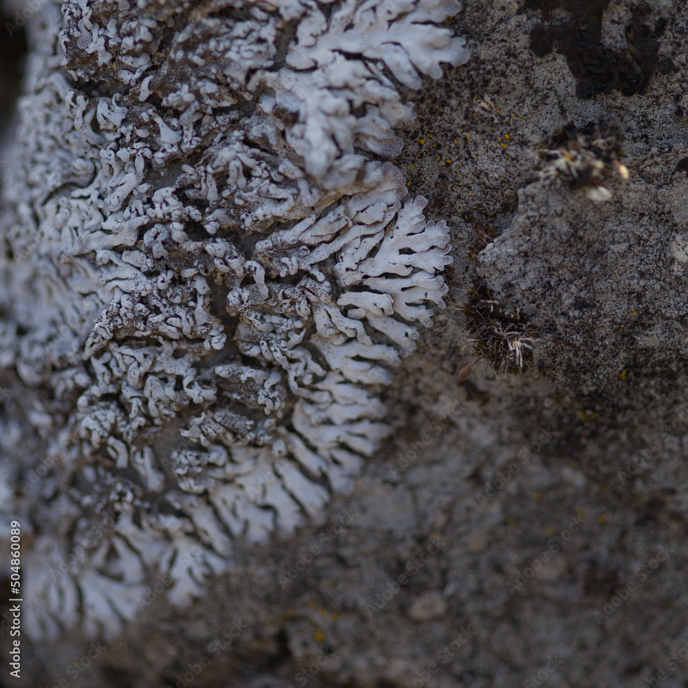 Pale cyan petals-like foliose lichen on rock, recent rains revived the vegetative body, natural macro background