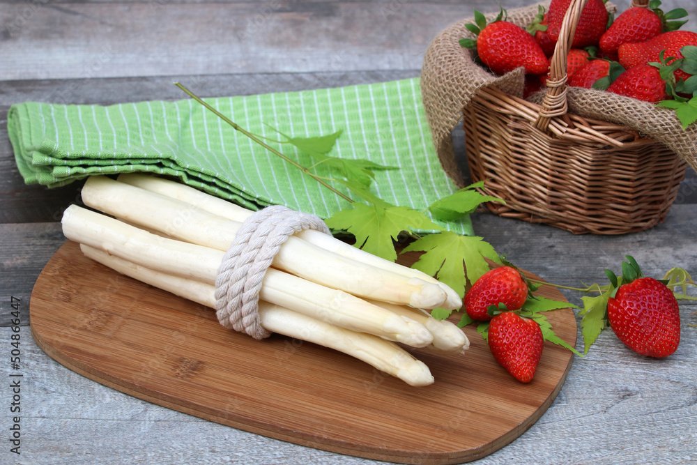 Weißer Spargel auf einem Holzbrett mit einem Korb frischer Erdbeeren.