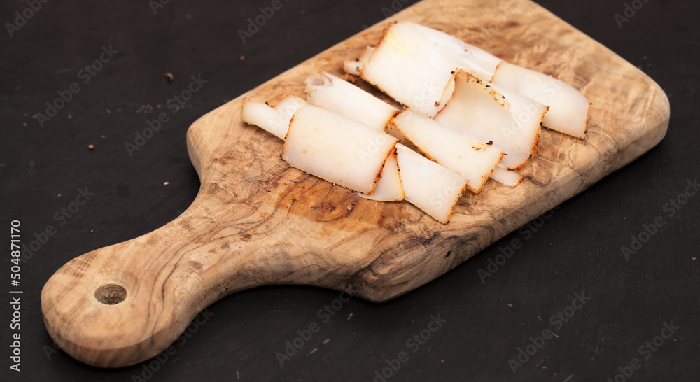 Dry salt salo, traditional Slavic food, slab of fatback frozen and thinly shaved