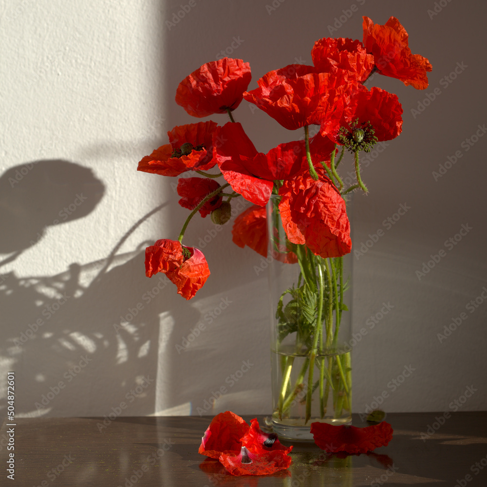 Flora of Gran Canaria - Papaver rhoeas, common poppy, small posy in a glass, losing petals