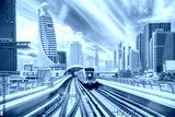 Monorail Subway train rides among glass skyscrapers in Dubai. Traffic on street in Dubai. Cityscape skyline. Urban background. Altered sky.