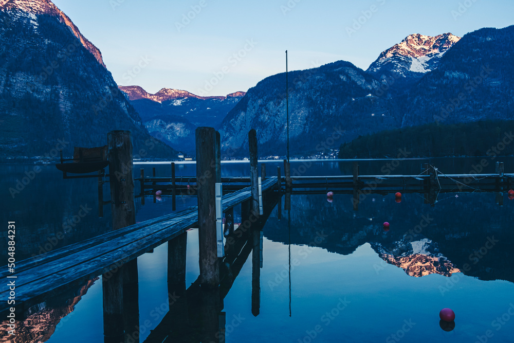 pier on the lake between mountains