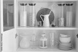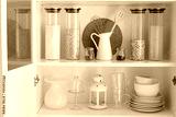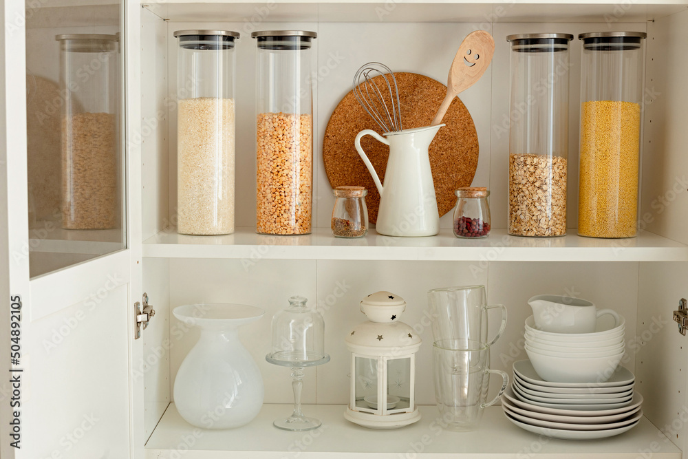 cupboard with dishes and glass jars with cereals and pasta, organized storage in the kitchen