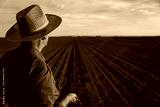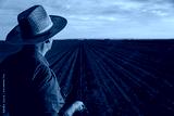Rear view of senior farmer standing in corn field examining crop at sunset.