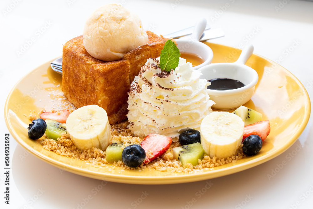 Honey toasted with ice cream, cream mousse and berry fruit on dish