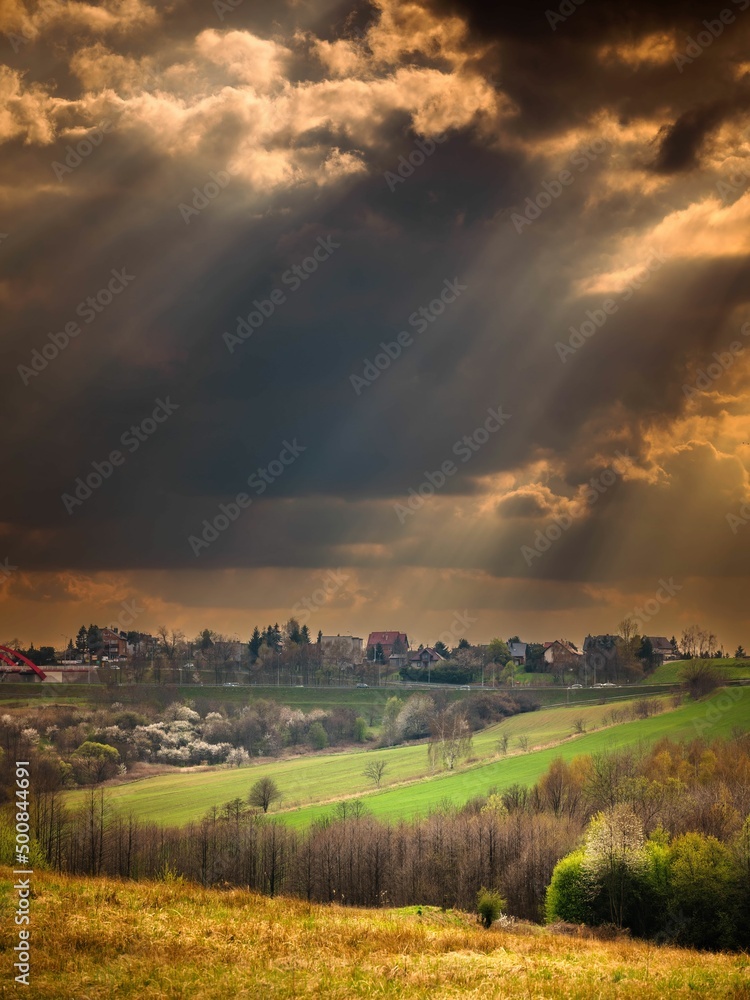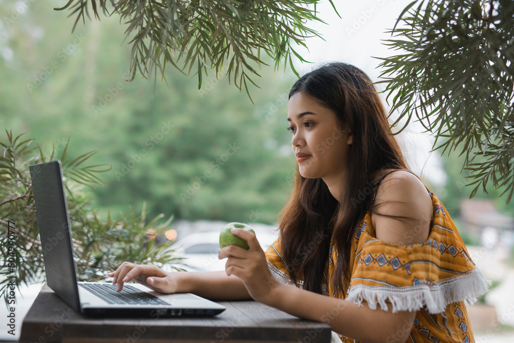Businesswoman or student girl with green apple using laptop computer outdoor with blurred nature background.