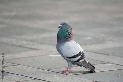 Front view of the face of Rock Pigeon face to face.Rock Pigeons crowd streets and public squares, living on discarded food and offerings of birdseed