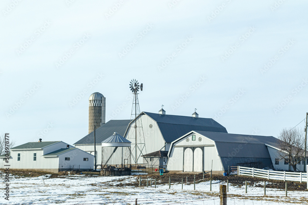 White Barns, Silo, and Windmill on an Amish Farm in Shipshewana, Indiana