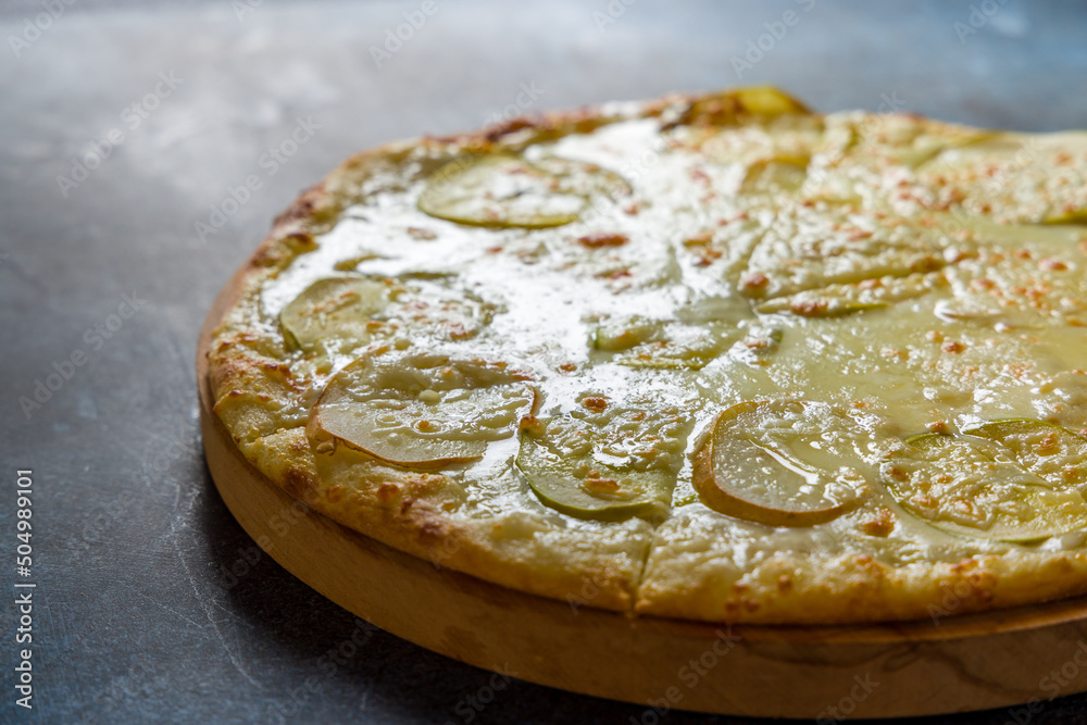 Pizza with pears and Gorgonzola cheese on dark blue stone table macro close up