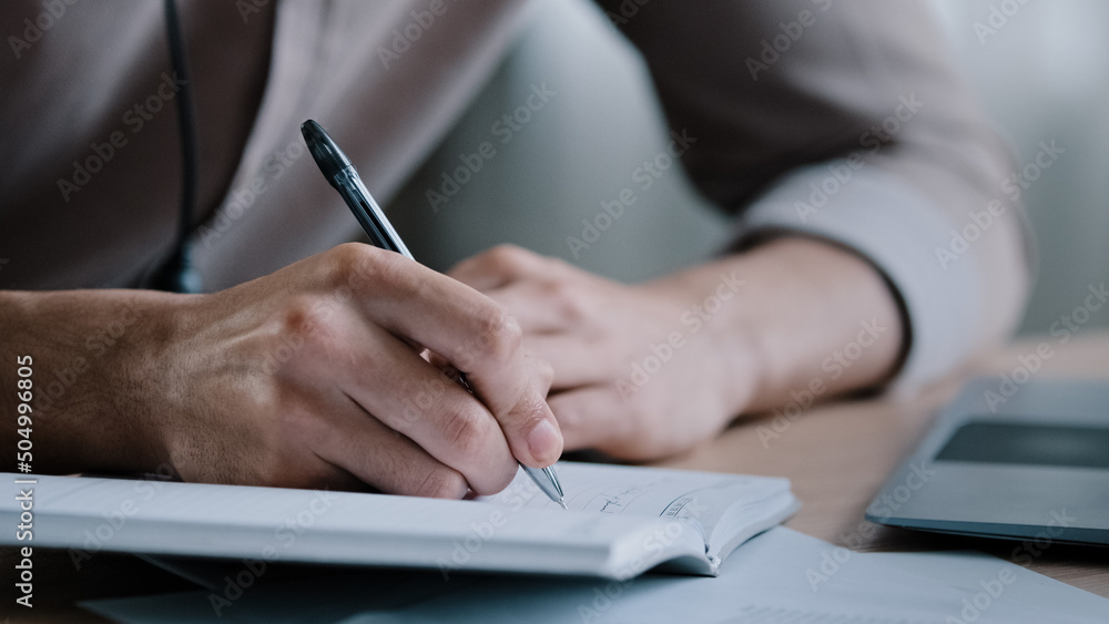 Close up unknown right-handed male business man write notes business ideas at organizer writer sit at home office hold pen notice information tasks in dairy making appointments self-education concept