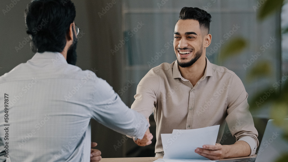 Two successful diverse business men colleague arabian salesman banker male manager shaking hand client customer accept common project successful corporate partnership deal agreement at office meeting