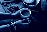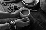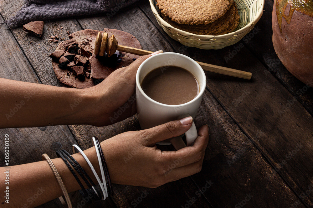 Manos de mujer sosteniendo taza de chocolate artesanal sobre mesa de madera antigua con galletas integrales