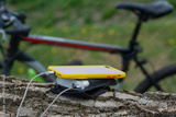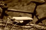 A portable charger charges the smartphone. Power Bank with cable against the background of wood and bicycle