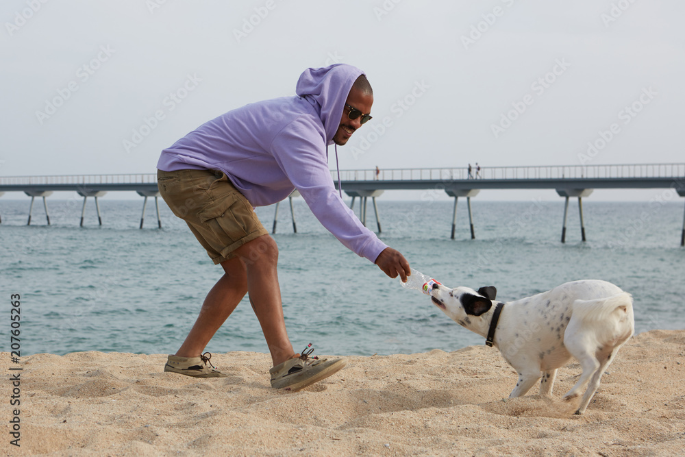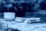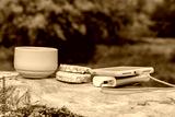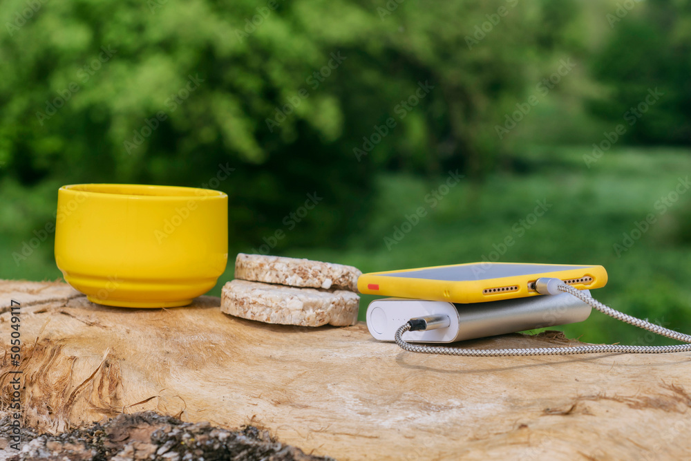 The smartphone is charging in nature. A portable charger power bank charges the phone on a tree against the background of a cup of coffee and cookies.