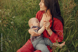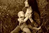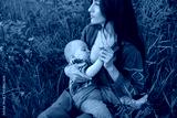 Woman sitting on a blanket and breastfeeding her little son