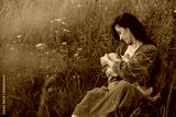 Woman sitting on a blanket and breastfeeding her little son