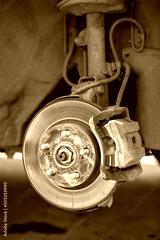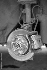 Disc brake of the vehicle for repair, in process of new tire replacement. Car brake repairing in garage.Suspension of car for maintenance brakes and shock absorber systems. Replacement of brake pads.