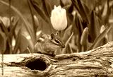 Small rodent chipmunk climbing over a log in a garden of spring tulips