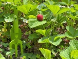 Strawberries bush in the summer garden. The first berry of a delicious strawberry.