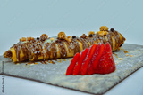 Pancakes stacked with strawberries and nuts, topped with chocolate sauce, sweet breakfast.