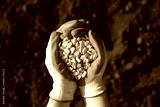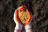 Hands in protective gloves full of corn on a background of black earth. The concept of harvest, sowing company or agriculture.
