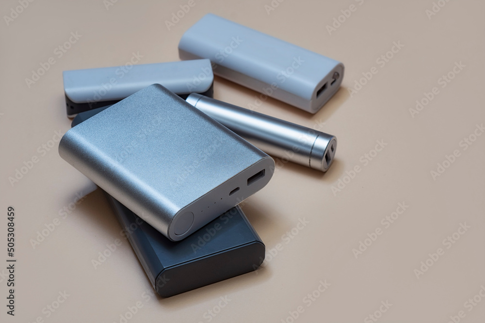 Set of power banks of different sizes on a light background. Choosing a portable charger.