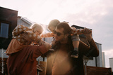 Mother father carrying children on piggyback outdoors on sunset neat house and playground. Mom dad going for a walk with daughter and son. Bright colorful funny family playing on sunset over house