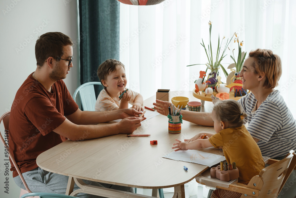 Family with kids having fun at home by the table, creating hand made art. Mother father and children drawing and communicating on the kitchen, emotional intellect