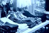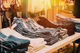 Stack Of Jeans On Shelves In Store Of Shopping Center. shelf display in shop mall store. Store Of Shopping Center. retail sale.