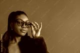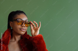 Fashionable confident Black woman wearing trendy sunglasses with leopard frame, yellow glass, orange color faux fur coat, posing on green background. Copy, empty space for text