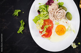 Fried egg, meat chicken roll, olives and tomatoes. Keto, paleo breakfast. Ketogenic food. Top view, overhead